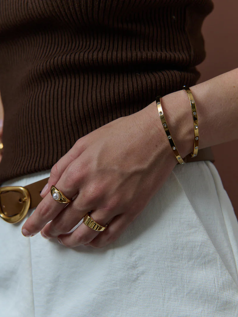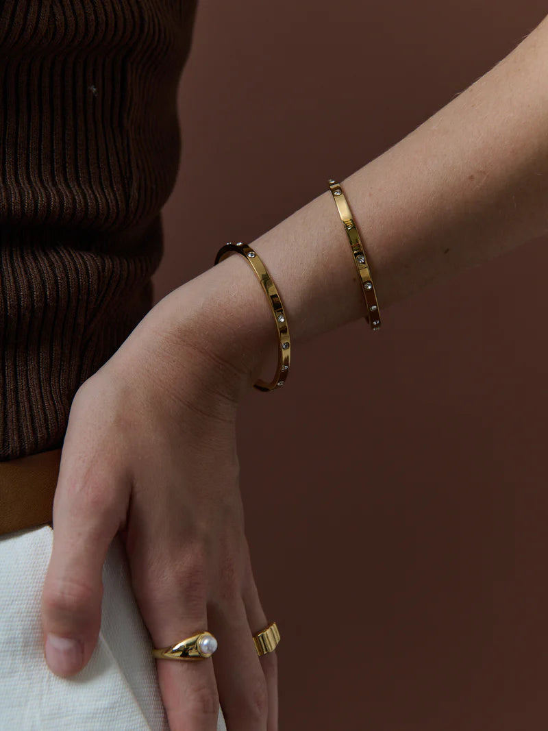 This hinged bangle features 18K fine gold plating on a sturdy brass base, adding a touch of elegance to any outfit. Its secure hinge closure allows for easy on and off, making it a versatile option for everyday wear. Enhance your wardrobe with this timeless and stylish piece.
