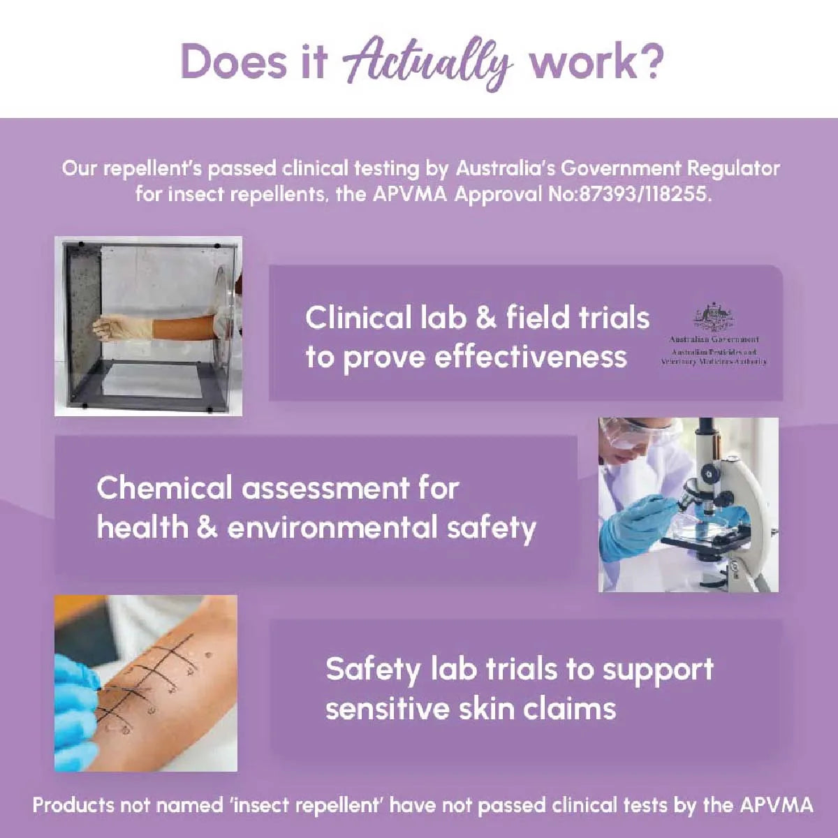 Good Riddance Sensitive Insect Repellent was developed in Darwin and tested in Kakadu as a gentler alternative to nasty DEET products and citronella filled natural repellents. The entire insect repellent range is APVMA registered and has undergone extensive clinical testing at independent labs across Australia to ensure it stands up against any DEET-filled mozzie and midge repellent products on the market.