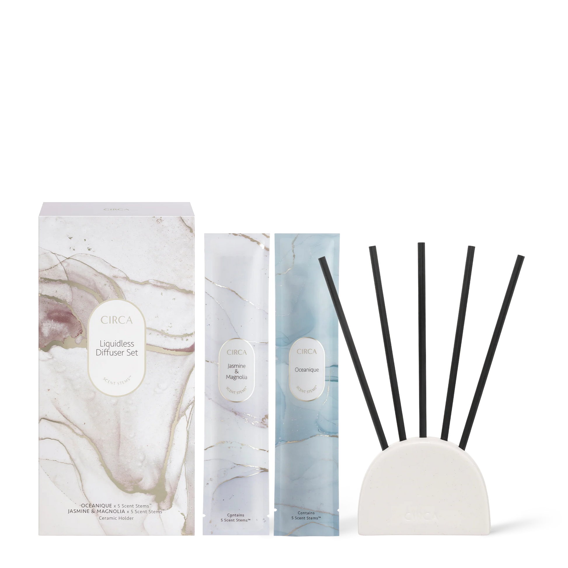 This duo set includes a ceramic holder plus two Scent Stem™ fragrances that use innovative dry diffusion technology: Oceanique and Jasmine & Magnolia