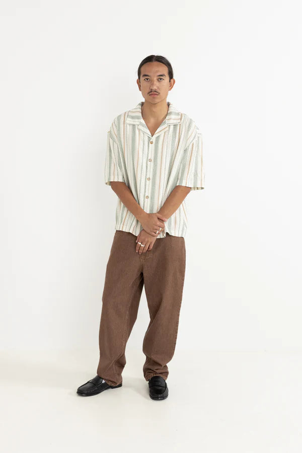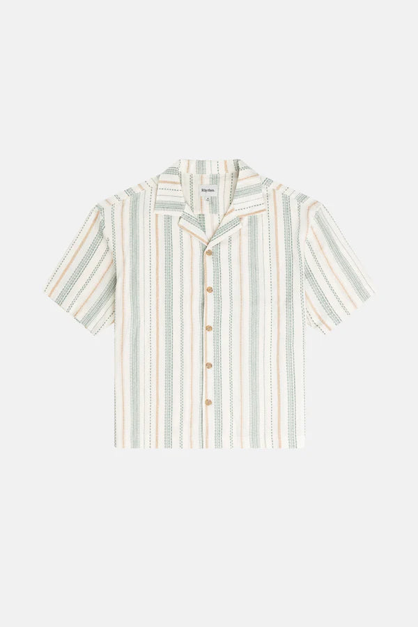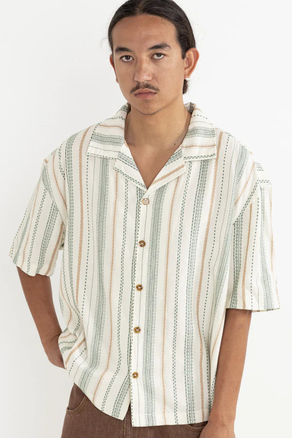 Embrace coastal ease with our Relaxed Stripe SS Shirt in Olive—a laid-back essential for the modern coastal man. The relaxed boxy fit, camp collar, and short sleeves ensure comfort and style. The split hem adds a contemporary touch, while the button-up front with tortoise buttons exudes coastal sophistication. Dropped shoulders and a Rhythm small label at the side seam above the hem complete the look, making it perfect for any seaside adventure.
